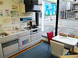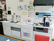 システムキッチンを常設展示。現在はタカラスタンダードのリテラを展示中です。最新のガラストップコンロや食器洗い乾燥機もご覧になれます。また、給湯器の多機能リモコンや浴室テレビも実際に操作いただけます。