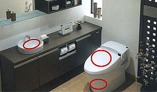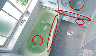 かがみのウロコ汚れ ・ 水洗金具の水アカ ・ FRP浴槽の水アカ ・ カミソリからのもらいサビ ・ ヘアピンからのもらいサビ ・ 浴槽床面のサビ