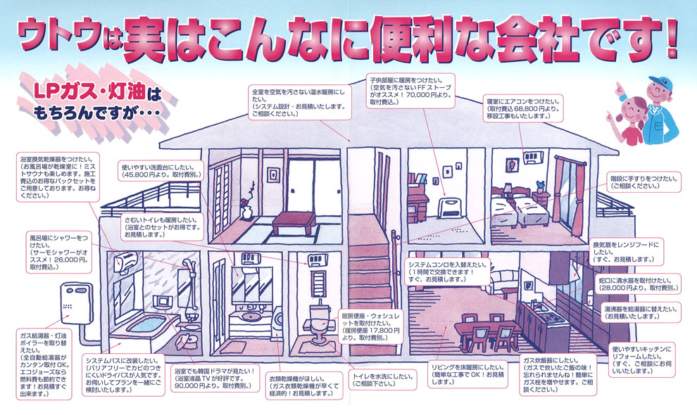 リフォームからさらにもう一歩踏み込んだ、空調システムの提案もウトウが得意とする分野です。頭寒足熱という理想の快適空間を実現する温水式床暖房、経済的で環境への負荷が少ないヒート・ポンプ・エアコンから石油暖房機まで、多彩なメニューをラインアップ。LPガス・灯油のエキスパートとして長年培ってきた豊富な経験とノウハウを活かし、お客さまの ご要望に最適な空調空間を実現しています。三菱電機、パナソニック、コロナ、長府など各種メーカーのルームエアコンの販売・施工も承っております。特に温水暖房システムは当社ショールームにて床暖房や温水ルームヒーター、浴室暖房機などを実際に体感いただくことができます。気になるランニングコストに関しても燃料販売会社という専門的な立場から、さまざまな料金メニューをご用意してお客様が納得のいくご説明、シュミレーションをさせていただきます。もちろんご相談は無料!新築をお考えの方も、遠慮なくご相談ください。
